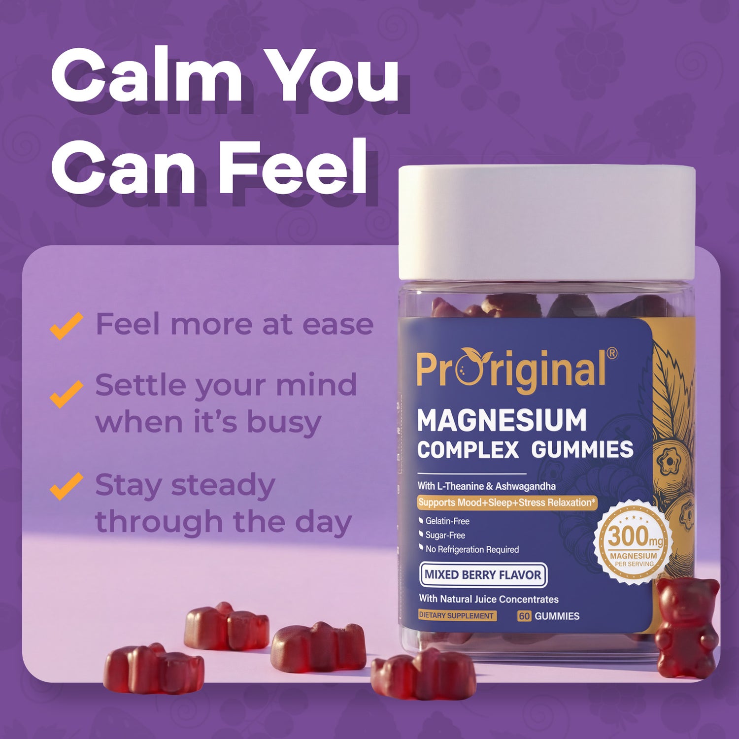 A thoughtfully crafted magnesium gummy made with four chelated forms of magnesium, plus Ashwagandha, L-Theanine, and Lemon Balm to support relaxation, a calm mind, and a healthy sleep cycle — helping you ease into your evening routine naturally.*